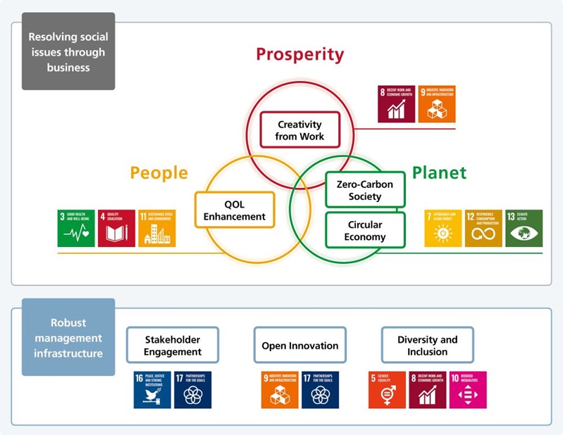 สำหรับกลุ่มบริษัทริโก้ สังคมที่ยั่งยืนในอุดมคติเป็นหนึ่งใน 3Ps Balance ได้แก่ People (ชุมชน), Prosperity (การเติบโตทางธุรกิจ), Planet (สิ่งแวดล้อม) ในการที่จะสร้างสังคมเช่นนั้น ริโก้ได้กำหนดความคาดหวังของผู้มีส่วนได้ส่วนเสีย 7 หัวข้อใน 2 ประเด็นหลัก ได้แก่ “การแก้ไขปัญหาสังคมผ่านการดำเนินธุรกิจ” และ “การจัดการโครงสร้างพื้นฐานอันแข็งแกร่ง” โดยสะท้อนให้เห็นถึงภารกิจของริโก้ แผนระยะกลาง (MTP) และความคาดหวังของผู้มีส่วนได้ส่วนเสีย นอกจากนี้ ริโก้ได้ตั้งเป้าหมาย ESG 14 ประการที่เชื่อมโยงถึงแต่ละประเด็นความสำคัญ และทุกคน ทั้งผู้บริหารและพนักงาน ต่างก็ทำงานอย่างหนัก เพื่อที่จะบรรลุเป้าหมายเหล่านี้ ริโก้จะไม่หยุดยั้งในการสนับสนุนความพยายามในการตระหนักถึงสังคมที่ยั่งยืนผ่านการแก้ไขประเด็นทางสังคม
